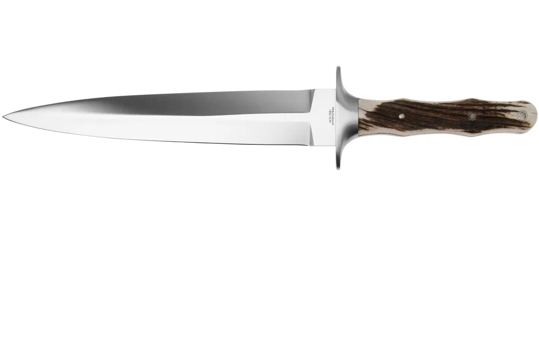 La Böker Arbolito Colmillo HX 02BA5918HX Stag es una daga de gran tamaño que impresionará incluso a los cazadores más experimentados. La sólida construcción full-tang y la hoja de doble cara garantizan que, además de ser bastante notable, esta daga sea también muy funcional. Este cuchillo es conocido como «Hirschfänger» o cazador de ciervos. Es una daga clásica alemana para matar animales de caza, como ciervos y jabalíes. Estas dagas se utilizaban sobre todo en las partidas de caza de la nobleza alemana.