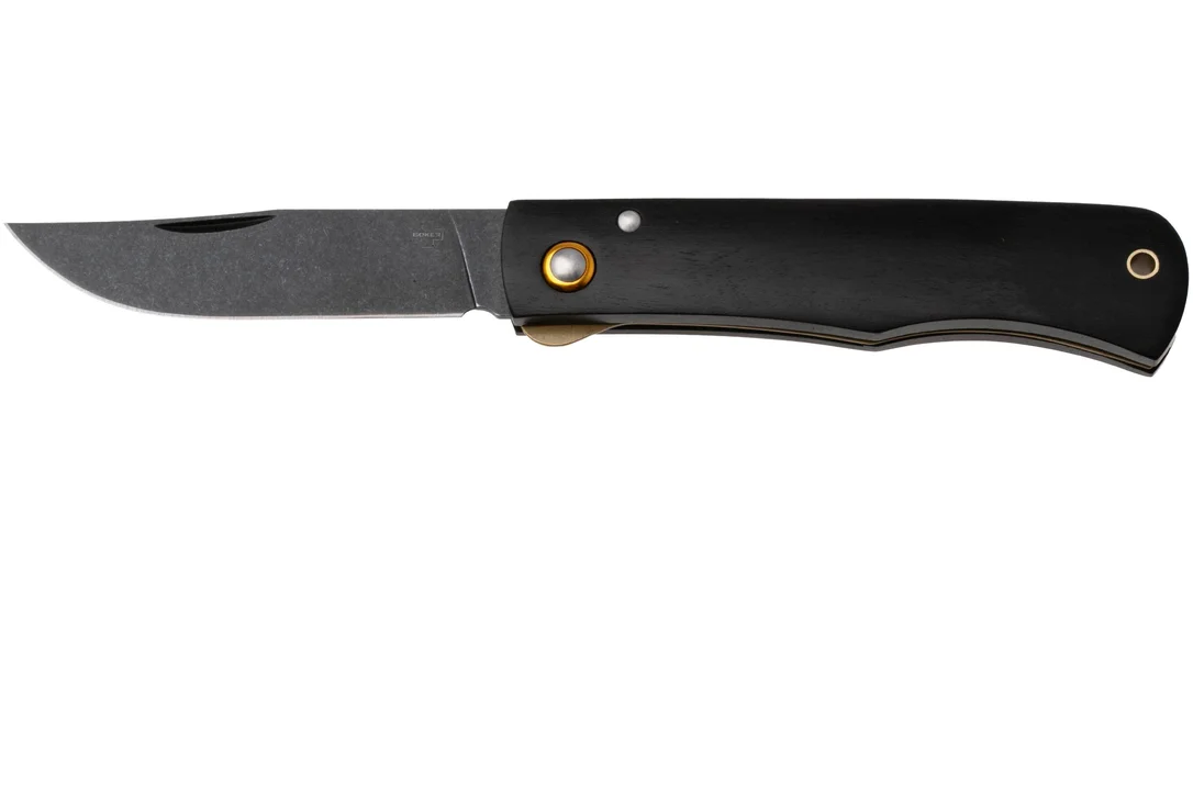 La Böker Plus Rusticus All Black 01BP0040, Blackwashed 420 Stainless Steel, Ebony Wood, navaja es una navaja EDC bonita de color oro, negro. Con una longitud de hoja de 8,5 cm, esta navaja es muy cómoda de llevar. Cuando está cerrada, solo mide 11,5 cm y pesa 60 g.