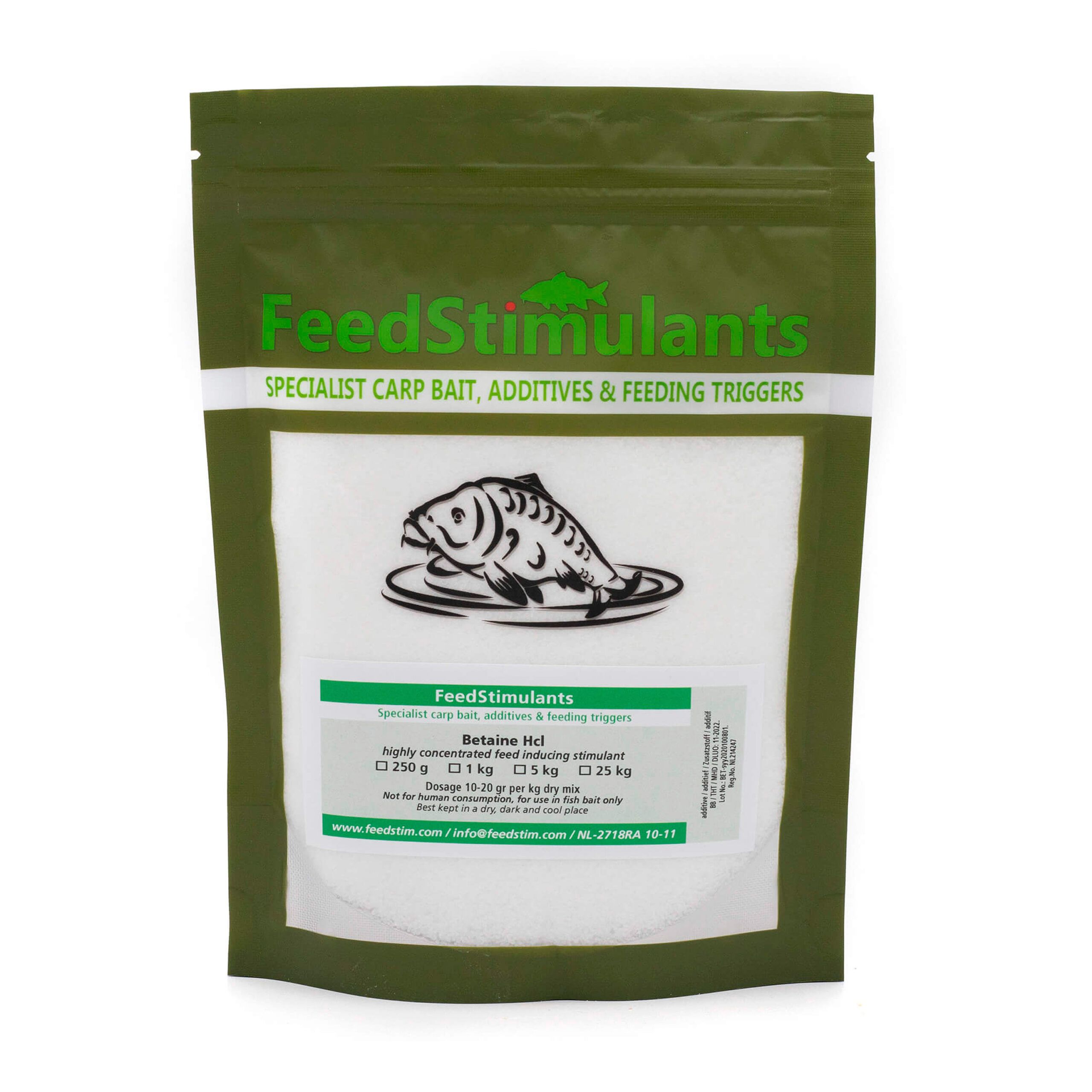 Máximo Rendimiento en tus cebos con Betaína de alta pureza para carpfishing. FeedStimulants Betaine HCL es uno de los atrayentes para carpas y estimulantes alimentarios más potentes y reconocidos en el mundo del carpfishing. Esta fórmula en polvo cristalino con más del 98% de pureza garantiza una acción eficaz y rápida para maximizar la ingesta de alimento por parte de las carpas, especialmente en condiciones difíciles como aguas frías o durante la temporada de invierno.