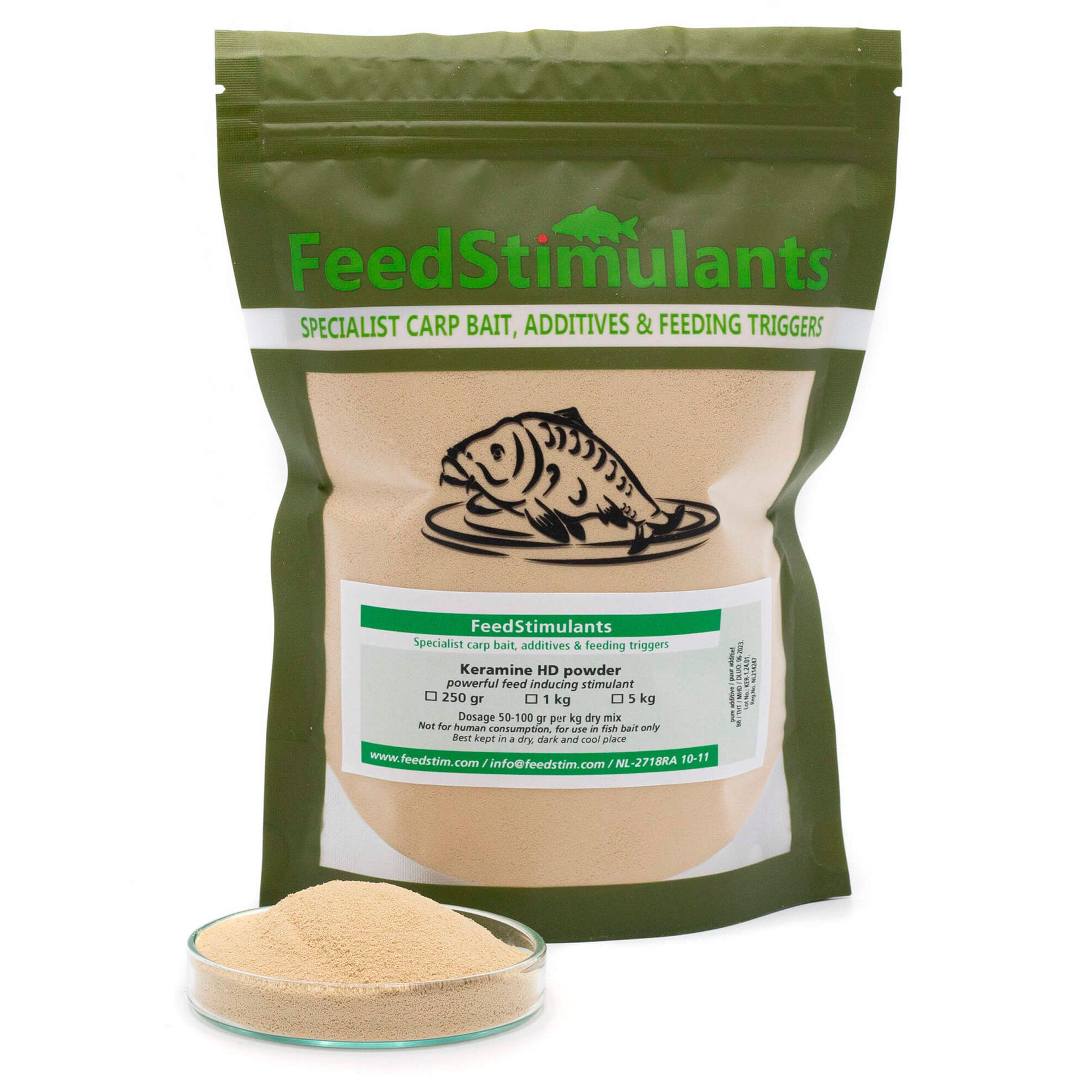 FeedStimulants Keramine HD Powder es un innovador estimulante alimentario en polvo, especialmente formulado para potenciar la atracción y apetito de las carpas. Su ingrediente principal proviene de una fuente única y sostenible: las plumas de aves de corral, de las cuales se extraen L-aminoácidos libres de bajo peso molecular, altamente digestibles (hasta un 50%).