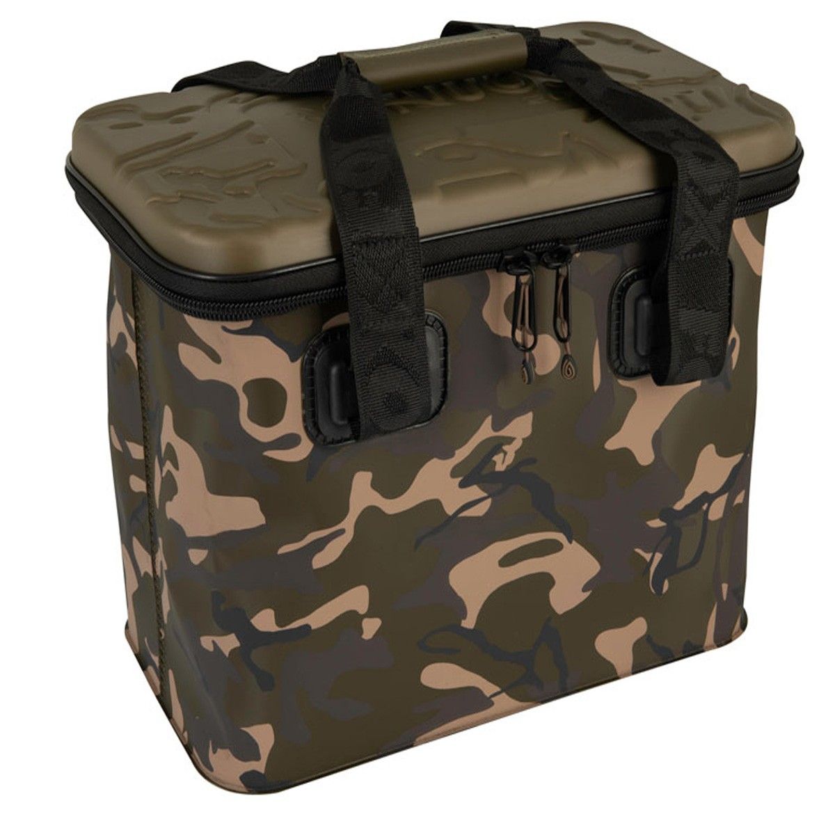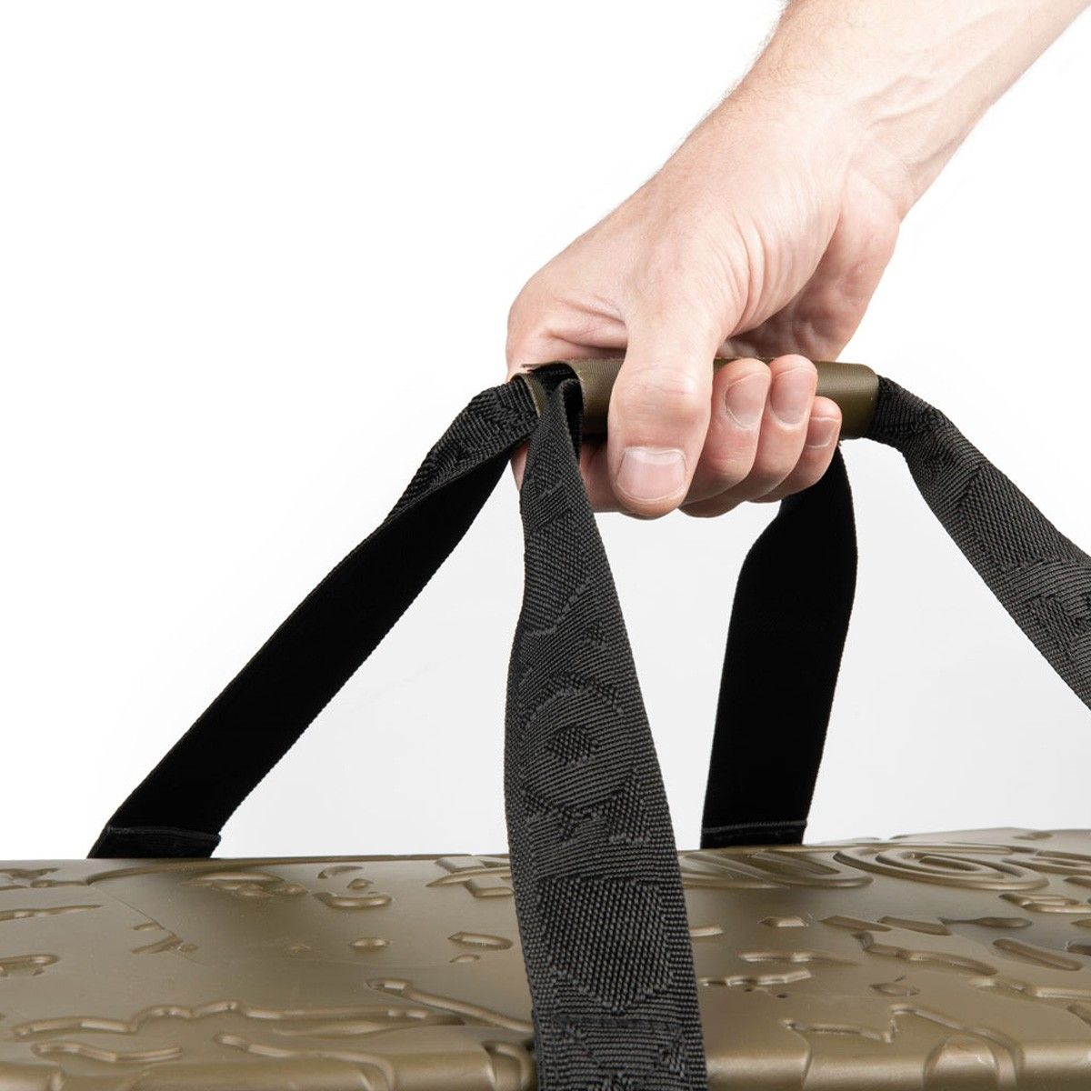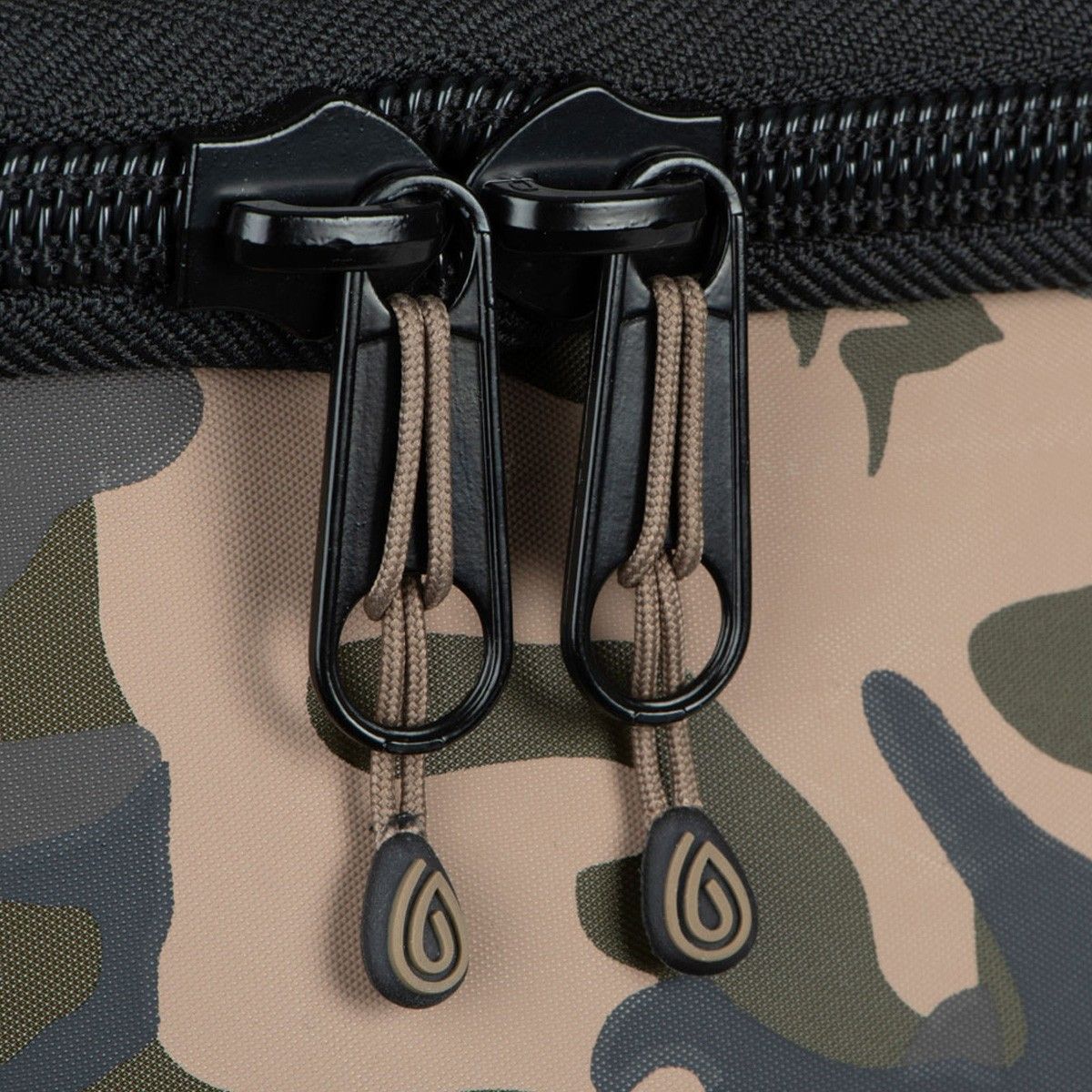Las correas de transporte de poliéster reforzado aseguran un agarre cómodo y duradero. Esta bolsa no solo destaca por su funcionalidad, sino también por su estética. El patrón Fox Camo exclusivo le da un acabado sobrio, discreto y muy apreciado entre los pescadores de carpfishing.