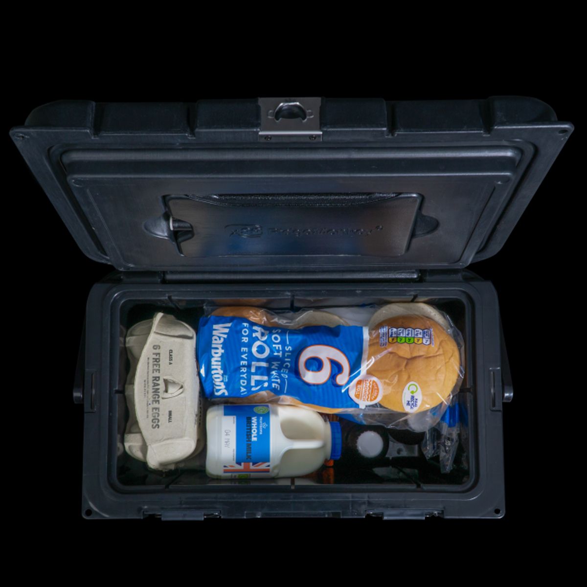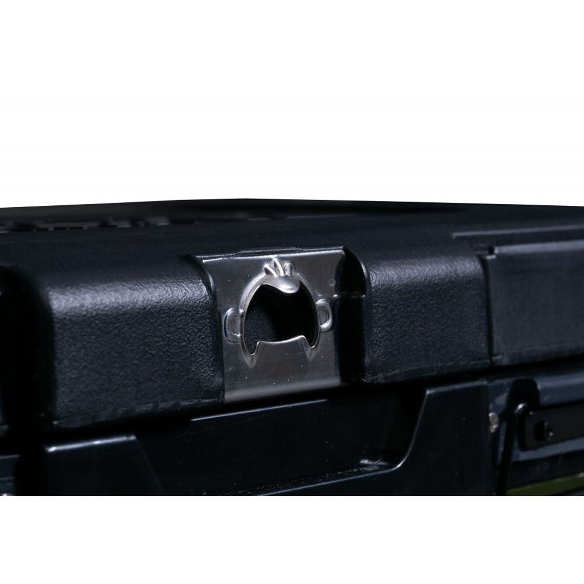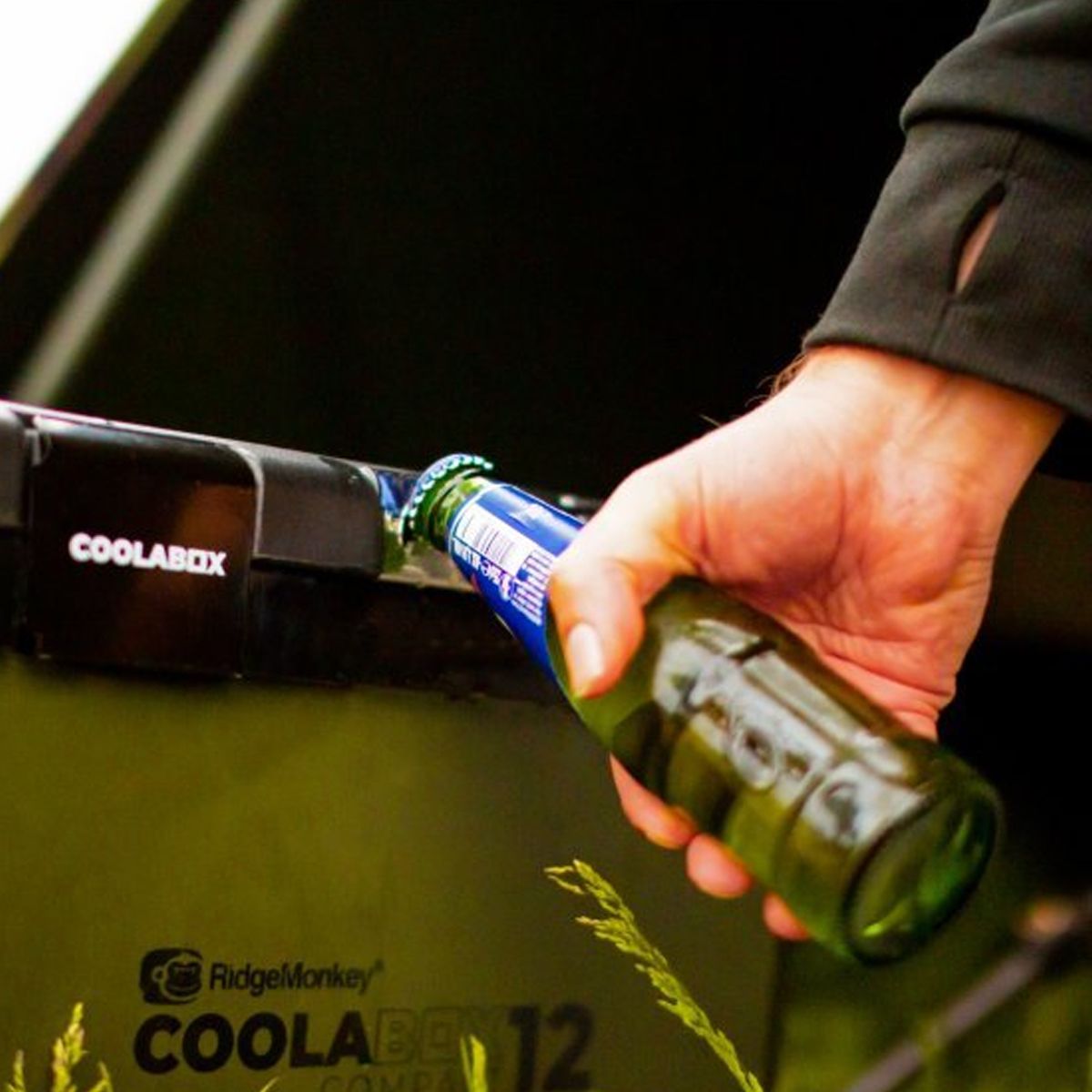 También cuenta con un abridor de botellas incorporado en el exterior de la tapa, ideal para no olvidar accesorios esenciales. Su asa de transporte reforzada permite moverla con comodidad incluso a plena carga, y el exterior duro y resistente protege el contenido ante golpes o condiciones adversas.