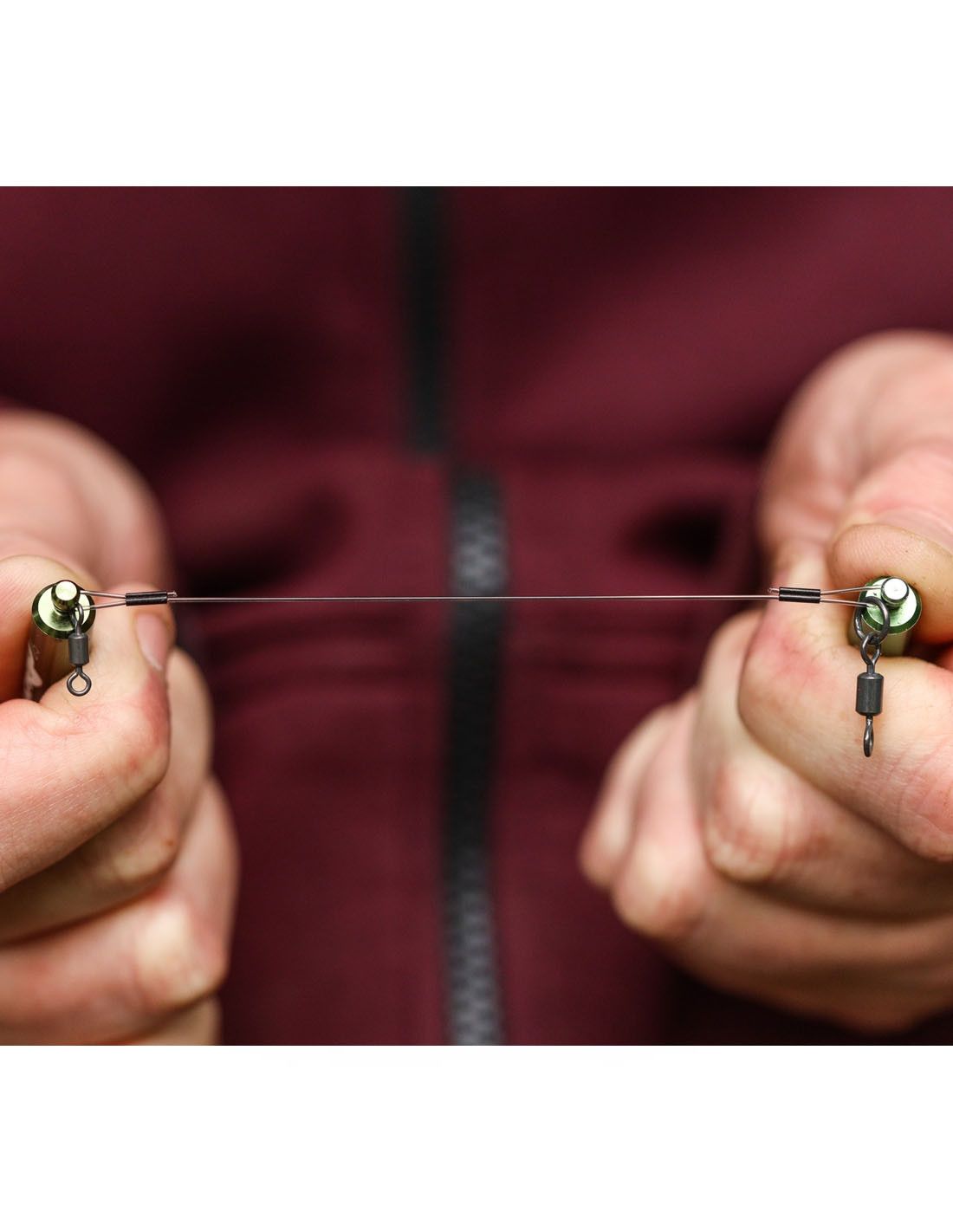 Crimp Link está fabricado con 100% fluorocarbono puro y presenta el mismo tinte que el material Tint Link, lo que proporciona una camuflaje discreto en el agua. Su rigidez equilibrada permite que el hooklink se flexione lo suficiente para mantener un movimiento natural del cebo y del anzuelo, evitando la rigidez excesiva que otros materiales pueden causar.